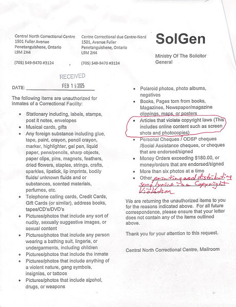 Over the years some of the letters that we have sent to incarcerated people have been returned to us, always with a form claiming that the information we sent violates prison policies around letters. The reasons given appear both arbitrary and inconsistent, citing reasons such as "copyright violations", or not accepting items like "internet printouts" or "photocopies".